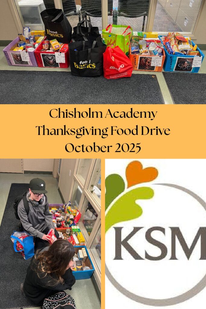 Chisholm Academy’s Student Council held a Thanksgiving Food Drive from September 29 – October 9, 2025. Staff and students were asked, if able, to please bring in nutritious, nonperishable food items and place them into the boxes outside of the office corresponding to their “Academy House”. Points were awarded to the houses based on the number of items donated. These food items were then donated to our local food bank, The Kerr Street Mission, to help combat hunger and poverty in our community.